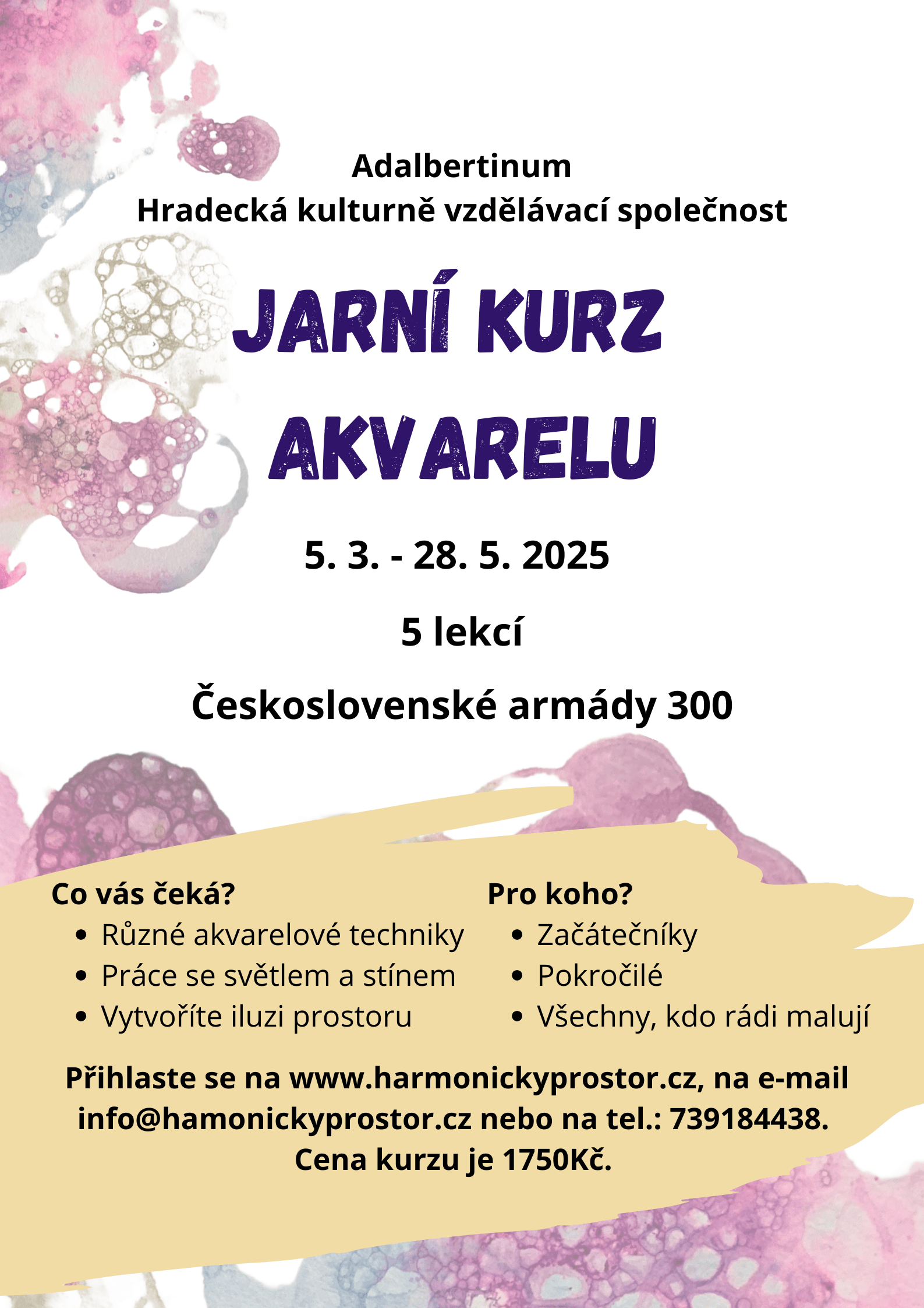 Zveme vás na Jarní kurz akvarelu. Čeká vás 5 lekcí v následujících termínech: 5. 3. 2025 19. 3. 2025 9. 4. 2025 14. 5. 2025 28. 5. 2025 Setkáme se v Adalbertinu v Hradecké kulturní a vzdělávací společnosti na Třídě ČSA vždy v 18:00. Lektorka Hana Kopecká připravila lekce pro úplné začátečníky, ale inspiraci zde...