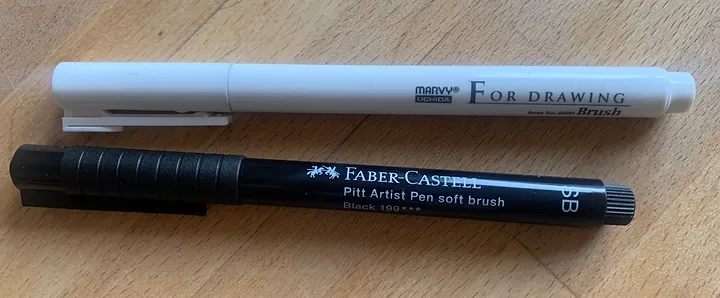 Obvykle jsem zastáncem klasických štětců nebo per. Teď jsem si koupila hned dva linery a přiznávám se, že mě potěšily. Nejdřív jsem vyzkoušela liner japonského výrobce MARVY – UCHIDA se štětcovým hrotem. Nadchl mě, pouze mi chyběla jiná užší velikost štětce, a tak jsem přikoupila ještě jeden od firmy Faber Castel, kterým na papíru zanechává jemnější stopu. Bohužel stojí o pár korun víc.